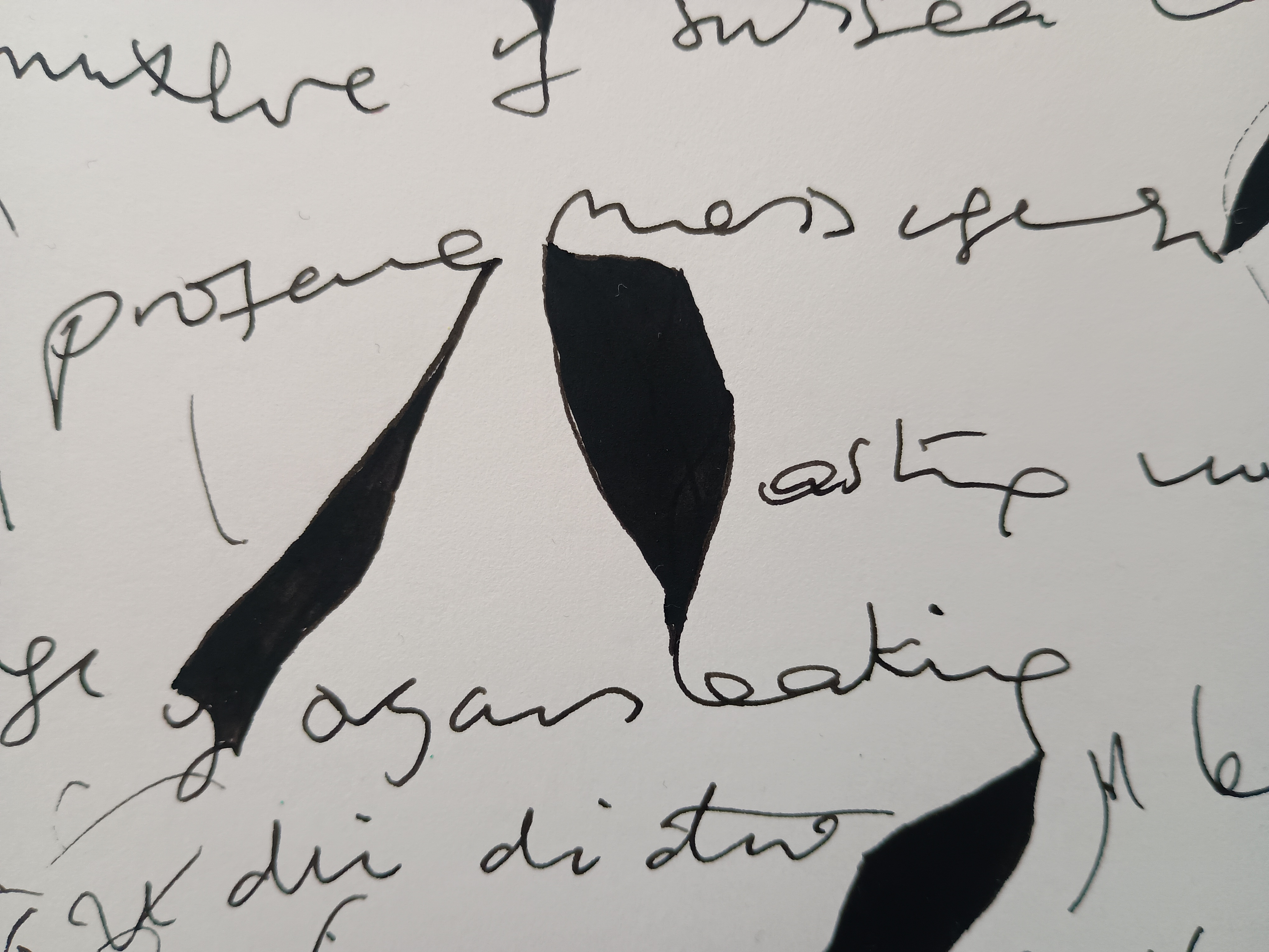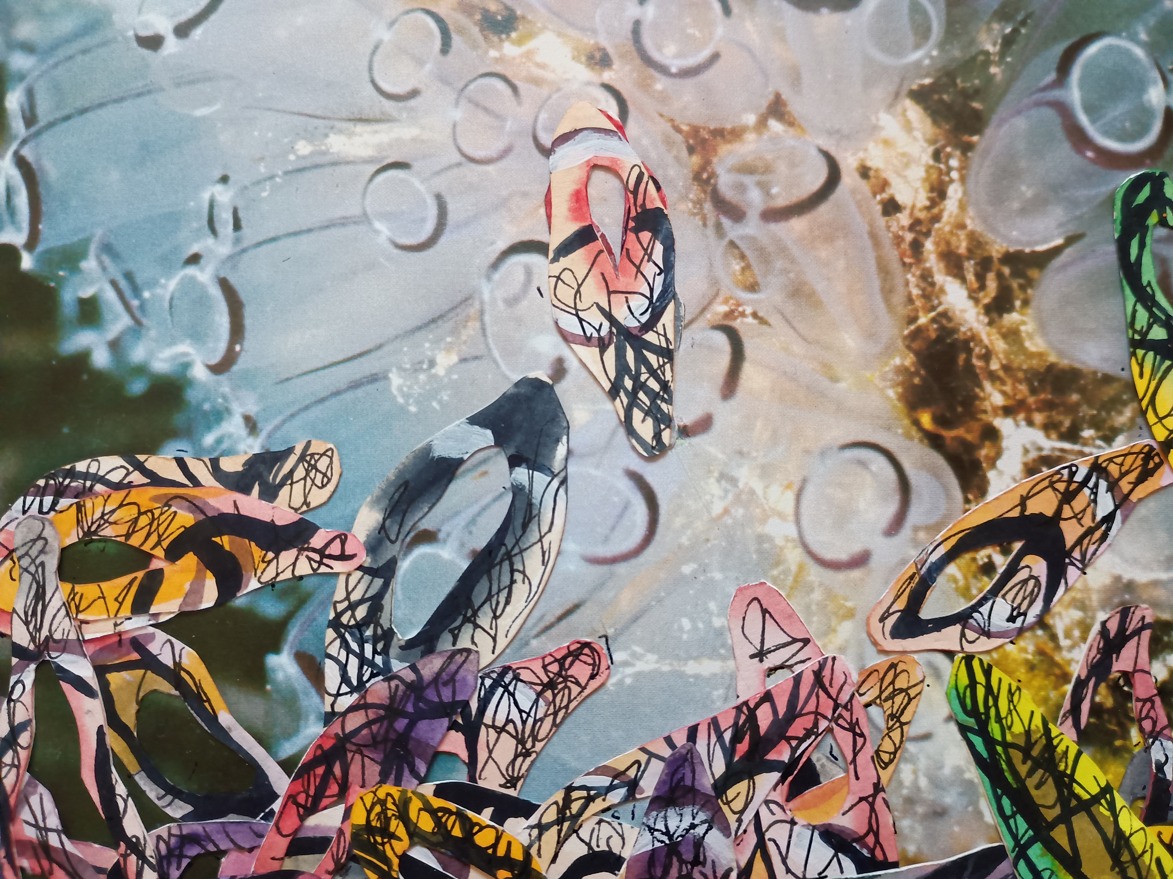 struggling to combine the clear devotion with a proliferation of anxiety the polarities of fragmentation and synthesis remonstrating with the comfortable years I heard it’s all about how it relates to your own life reaching for clarity by bending and twisting the torso which results in a barely detectable arrested coiling from side to side with the satin skin and the moisture that leaks from around your features offering the salvation of cleansing fluid applied to the face and the innocence of liquid as it runs off the land some have absences cut until the material barely holds together there’s softness and tenderness in writing where colours become pale and the words become froth and foam caressing and moisturising the skin