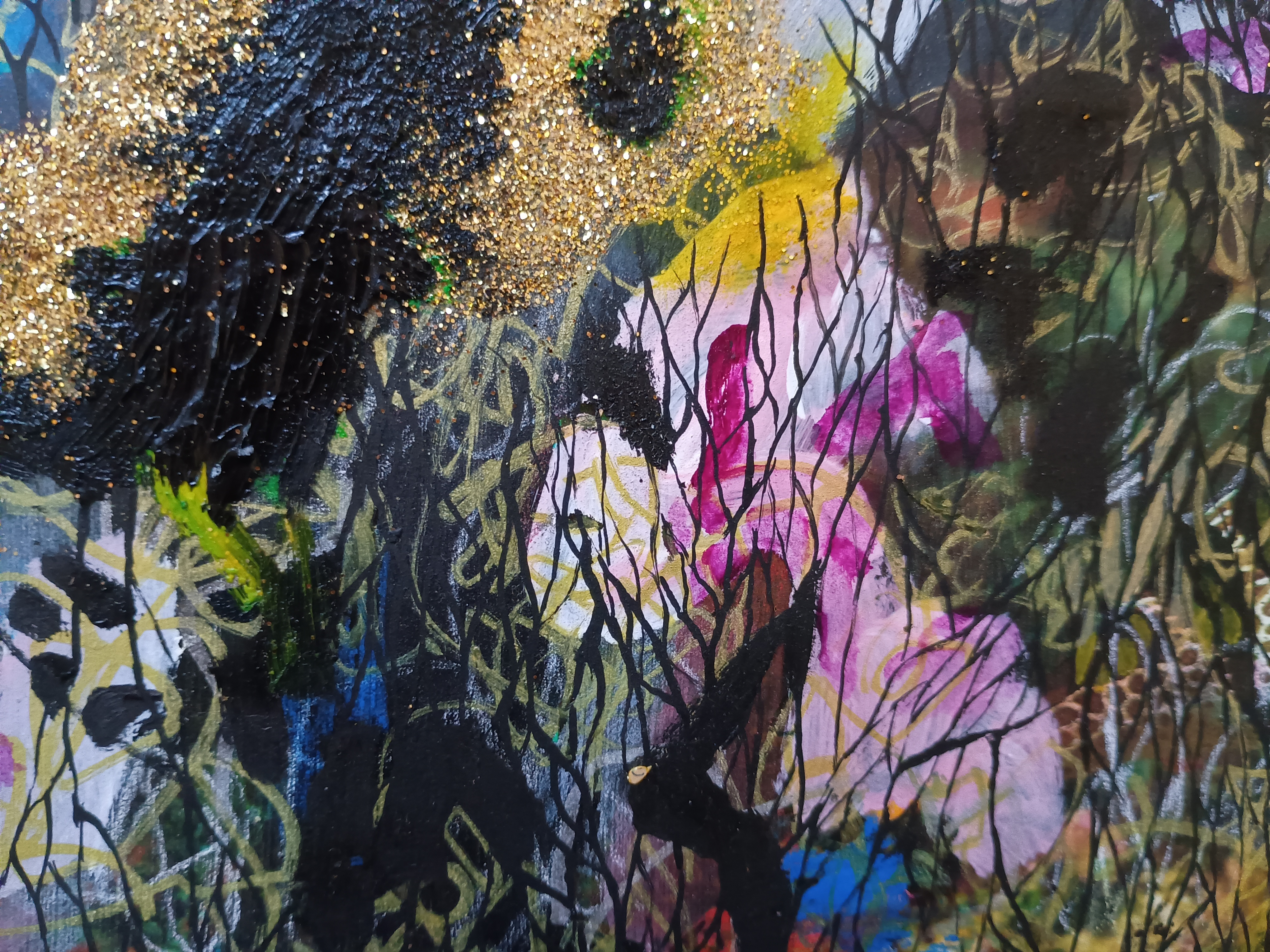 There is a bulbous vivid green moss-coated pile of swollen limbs expressions of well-fed flesh. The branches and twigs are discontinuous gestures toward something primordial and they’re echoed by painting which in its particularity is necessarily integrated into expression and description. Gestures occur everywhere around us pointing toward something new having been achieved as we welcome ecstasy. Looking to the glittering earth, leaking water and the concentration on the feeling of air on one’s face, attention turned away from the catastrophic slop of images and words engulfing themselves.